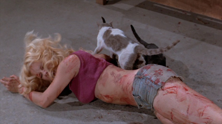 Best of all, Sweet Sugar has a giddy, inexplicable craziness to it that you hope was deliberately crafted at the typewriter (scripter Spencer certainly seems bright enough to do that)…but which could just as easily have been a happy accident due to ineptness out in the field. How else do explain Sugar and Simone grinning like idiots as they’re first trucked into their hellish prison (I thought the feather boa and cocktail earrings were a nice touch for the “Banana Republic Indentured Slave”’s new look in ‘72). Did Spencer and Leveseque deliberately make Osmond comically push Cole and Houghton around like Moe did with the other Two Stooges? Who perfectly timed that droll appearance by the government inspector, who introduces himself to the new cane workers before immediately announcing he’ll be back in a few weeks (at this early point, you’re sure Sweet Sugar is going to be more live-action cartoon, rather than grim exploiter)? And who’s responsible for Sweet Sugar’s most notorious scene: the tabby cats attack, where several sleepy domesticated pussy cats, vaccinated back into a primal state of savagery, are thrown onto our heroines? Grasping their limp kitties (haha! Read that again!), the girls badly pantomime being clawed to death—how did they keep straight faces—as the poor, discombobulated kitties wander around aimlessly, looking for some food? The answer to those questions: who cares? Just thank god they got it all on film.