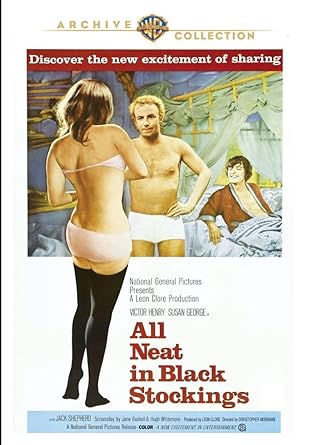 Warner Bros.’ Archive Collection line of hard-to-find library and cult titles has a remarkable forgotten gem in its queue: All Neat in Black Stockings, the 1969 British “sex comedy” produced by teeny tiny Miron Films, and released in the U.K. by Anglo-Amalgamated Productions (National General Pictures handled the roll-out here in the States…to that brief company’s usual uninspired results). Based on a novel by cult author Jane Gaskell (who co-wrote the screenplay with Hugh Whitemore), and starring Victor Henry, Susan George, Jack Shepherd, Vanessa Forsyth, Terence de Marney, Anna Cropper, and Harry Towb, All Neat in Black Stockings seems to have confused some critics, then and now, as to whether the movie considered itself a raunchy comedy or a so-called “kitchen sink” melodrama.