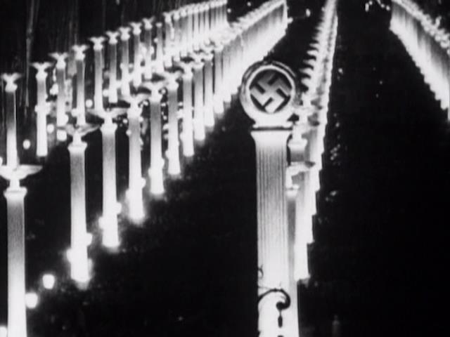 If Mora oversteps at times with obvious commentary, such as having the Helen Morgan torch song, What Wouldn’t I Do for That Man, play over shots of Hitler (or, sad to say, making Noel Coward’s delightfully fierce Don’t Let’s Be Beastly to the Germans sound trite), those are isolated moments. He consistently hits his target, frequently with the scenes that somehow upset the baffled critics. How could a reviewer not see the obvious connection between Mora slowing down and repeating a shot of a “humanized” Hitler cuddling a baby at a private ceremony, followed and intercut with a manipulative Hitler “cuddling” his receptive, adoring audience at a rally…followed by Nazi henchmen Herman Goering and Goebbels handing out toys to children at Christmastime? What part of that montage didn’t you get, fellas?