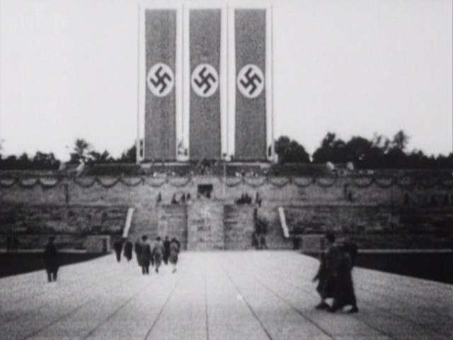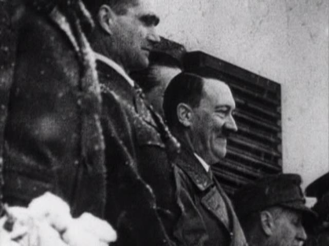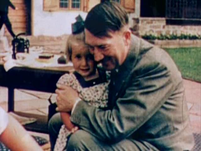 At first glance, Swastika’s main claim to fame is the re-discovery, during pre-production, of Hitler mistress/wife Eva Braun’s 16mm home movies, which formed the basis of this documentary on the Nazification of Germany. In her color footage (it was extremely rare and expensive at that time to shoot in color), civvies-clad Adolph Hitler is seen relaxing at his spectacular Bavarian mountaintop retreat, the Berghof, with prominent Nazis like Heinrich Himmler, Albert Speer, Joseph Goebbels, Joachim von Ribbentrop, and Martin Bormann all milling around, smiling and joking for the camera. It was the only known movie footage depicting Hitler outside of military and political rally situations, and as such, of great historical importance (at least, initially, to the producers of this documentary).