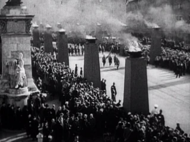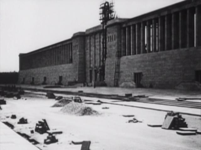 Mora constantly intercuts these idyllic rural pastiches with the crushing, brutalizing nature of the Nazi rallies, with their apocalyptic, Wagnerian scale and absolutely rigid formations, where the German people became part of a mass thing that lost all individuality and ultimately, humanity. And of course, to reinforce that dehumanization, and keep a lid on any seditious free thought, the center of non-democratic Nazi government—the grotesquely over-scaled, crassly opulent New Reich Chancellery—is shown by Mora’s selections to be an oppressive entity that’s specifically designed to overwhelm and cow anyone who dares enter it (and let’s not forget the goon squads that are needed to keep order, such as the ’38 Munich “Commemoration of Dead Comrades” rally, shown here in deadly, terrifying stillness, the helmeted soldiers lined up like emotion-less mechanical robots, illuminated by huge barbaric torches and phony De Mille-lite mythologizing).