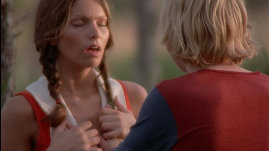 As Carol and Chuck connect over a joint, Carol turns on some good ‘ol boys who pass the bus, flashing them as she grooves on pot. Soon, the weather turns ugly, and a detour leads the bus deeper and deeper into the deadly swamp, until the bus gets stuck but good. Instead of being sensibly terrified as most people would be, Carol and Chuck decide, as hippies will do, that this is the perfect time to run through the woods naked. Exploring their hippie Eden, Chuck and Carol get naked, swing on swings naked (um….where did that come from out in the middle of nowhere?), play with baby raccoons (clothed, because they bite), dance around naked, and run through the forest naked.