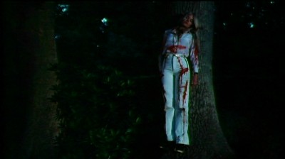 But when James’ new-found cousin, Ann (Carolyn Courage) gets in on the act, while in a trance she almost lops James’ head off with a battle sword. This is small potatoes compared to what happens to Carol; walking home to her actress hostel, she’s viciously stabbed over and over again, winding up pinned to a tree with knives. Ann, who lives at the same hostel, comes home and washes some suspicious blood off her hands, while roommate Suzy (Sarah Keller) looks on in alarm. What follows is an unending series of graphic slayings as we try to decide who’s killing whom…and why.