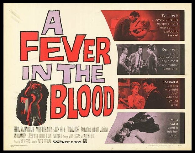 Another 1950s-1960s Warner Bros. gussied-up big-screen feature starring their TV contract players, A Fever in the Blood is certainly an excellent case study—economically and aesthetically—of that unsuccessful tactic of hoping TV stars would draw TV audiences back into the faltering movie houses—a quick, cheap fix to box office woes at the time that, overall, didn’t exactly pay off in big dividends for the studio. In a lengthy Archive of American Television interview, producer/writer Roy Huggins (of Maverick, The Fugitive and The Rockford Files fame) discussed how he came about producing and writing A Fever in the Blood, spending far more time detailing the rancorous backstage dealings with Warners that led up to the assignment, as opposed to one or two brief comments about the actual movie itself (which should give you a clue as to what Huggins thought of the final product).