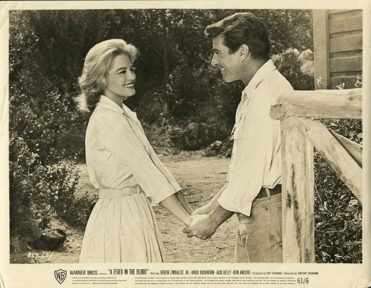According to Huggins, he was “given” TV actors like Efrem Zimbalist, Jr. and Jack Kelly, along with other Warner contractees like Angie Dickinson and Ray Danton, against his will, regardless of whether or not they fit the characters in his script for A Fever in the Blood (co-written, the title card states, by Harry Kleiner, of House of Bamboo, Fantastic Voyage, Bullitt, and Extreme Prejudice fame…although Huggins never mentions him in the interview). When A Fever in the Blood failed to impress critics or the public, Huggins finally moved on (several times) to other studios.