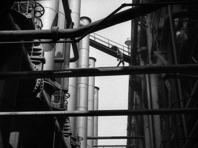 To drive his and Hayward’s point home about Grant’s doppelganger identification with “The Judge,” Fleischer shoots long shots of Grant and “The Judge” fighting over a cat walk so that both are indistinguishable from each other during the exciting finale at the industrial pumping station. With Grant mirroring the reveal of his face just as “The Judge” did on the steps of his apartment, Fleischer shows the horror on “The Judge”‘s face when he sees his spiritual double. You don’t have to be a student of Freud to see the significance of the final desperate struggle between the two, high over the station on a cat walk, with Grant holding onto “The Judge”‘s handcuff for dear life, as they both try to rid themselves of each other before they splatter to the ground. There’s no need to understand or have stated the motives of “The Judge’s” serial crimes: one only has to look at the illogical, deeply disturbed obsessiveness of his spiritual double, Grant the cop, to see why he kills.