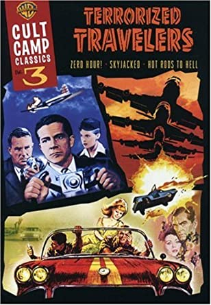 …which somehow brings me back to Warner Bros.’ boxed set Cult Camp Classics Vol. 3: Terrorized Travelers. Why it brings me back to this DVD set I can’t remember how—it’s been a tough week (Wait: yelling dad. car. gas. bodily harm. Freud. Got it). Packaged under their thankfully discontinued Cult Camp Classics line—that word “camp,” jesus—Cult Camp Classics Vol. 3: Terrorized Travelers includes: 1957’s Zero Hour!, directed by Hal Bartlett, written by Airport‘s Arthur Hailey and John Champion, and starring Dana Andrews, Linda Darnell, Sterling Hayden, and Elroy “Crazylegs” Hirsch; 1967’s Hot Rods to Hell, directed by John Brahm, written by Robert E. Kent, and starring Dana Andrews (again), Jeanne Crain, Mimsy Farmer, Paul Bertoya, Gene Kirkwood, and Laurie Mock; and 1972’s Skyjacked, directed by John Guillermin, written by Stanley R. Greenberg, and starring Charlton Heston, Yvette Mimieux, James Brolin, Jeanne Crain (again), Rosie Greer, Walter Pidgeon, Leslie Uggams, and Susan Dey. It’s a fun exploitation triple feature for arm-chair travelers who can’t travel any more because of the real terror out there at the pumps.