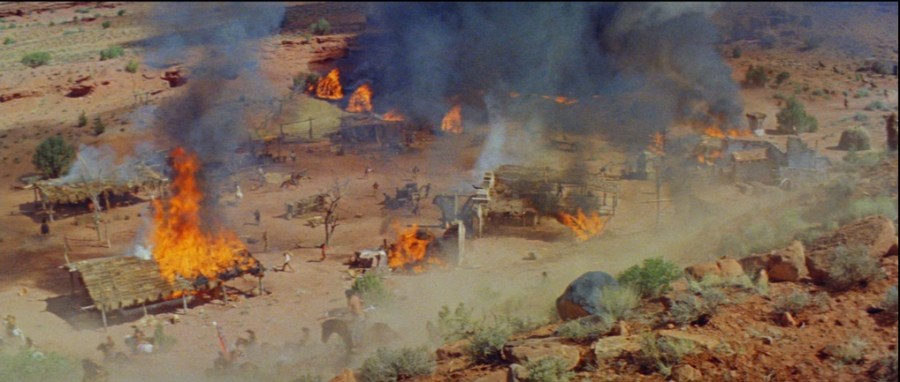 Wayne and Whitman dodge and weave about, trying to get the upper hand on each other (although not nearly in as a compelling or humorous a manner as say, Cary Cooper’s and Burt Lancaster’s dueling in Robert Aldrich’s brilliant Vera Cruz). Often, however, they’re reciting dialogue, not riding or shooting. When the occasional action sequence does crop up, it’s not particularly memorable or distinguished (both of the major Indian attacks are choreographed in an almost identical manner), and then the movie stops again while everyone chaws at each other.