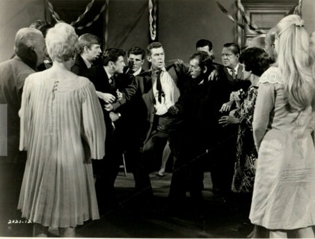 Aside from any deeper meanings that can be gleaned—if you really stretch—from the screenplay, Angel in My Pocket has a surplus of that homespun-but-sly Fritzell and Greenbaum (and Griffith) wit that suffuses even the TAGS episodes they didn’t write. You’d be excused in thinking Andy Taylor walked into the Whitehead house when Griffith keeps repeating, “Just fine! How are you?!” to his two sons, when they keep asking him how he’s doing after his workday. Lovely Lee Meriwether (who’s just right in this role: good-humored and bright, and frequently laughing at the silliness around her) luxuriates in her romanticized snap judgement of Wood Falls (“It smells so nice and peaceful!”)…right before they pull up to the town riot, where she switches modes, yelling out to Griffith, “Watch out for your partial!” (I love her later checking it, after Griffith gets smacked in the jaw, sticking her thumb in his mouth and shoving it around, checking the fit).