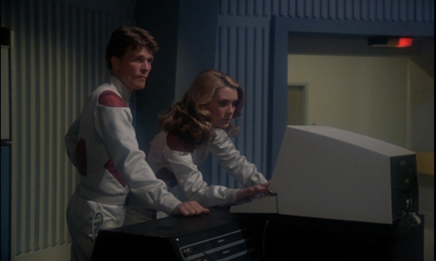Some of Lager’s ideas are sabotaged by the limited production (we’re told Earth is an uninhabitable wasteland savaged by war…but Benton and Campbell touch down to a stark, rather gorgeous Ontario woodscape that just needs a little cabin with smoke coming out of its chimney to make us feel all toasty and cozy inside), while others are hinted at but not developed. One original element this knock-off has over Star Wars: Sparks the robot has sexual feelings for his master—he stares at Benton with lust, and smoke comes out of head when she touches him…but any further exploration of funky robot/hottie action is dropped before the flesh hits the metal (Lager also pens a scene remarkably similar to one later used in Star Trek II: The Wrath of Khan, when Morse willingly takes a deadly dose of radiation to put the Starstreak’s engines back on line).