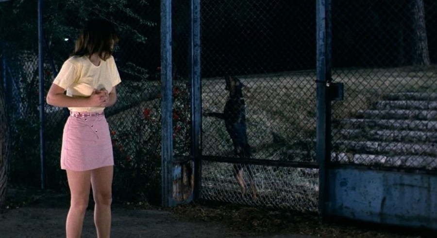 For most critics, the extended, crawling—and totally pointless—crane shot outside of D’Angelo and Banti’s apartment building appears to be their favorite stylistic moment in Tenebrae, but I was far more impressed with Wendel’s uncomfortably prolonged attack by dog and finally, the killer. Beginning in a creepily-deserted nighttime suburban crossroads, Argento has Wendel’s “nice kid” character unaccountably torment a vicious fenced-in dog, only to be chased through the streets by it, bitten several times, as well, before she eventually finds (momentarily) refuge in the killer’s house. It’s an exceedingly odd, strange sequence; its choppy editing and hazy, running-in-place pace remarkably mirror a nightmare. Equally impressive is Argento’s twist on Hitchcock’s North by Northwest crop-duster sequence, amplifying that scene’s sense of isolation by killing off Saxon in a sparsely-populated pedestrian mall, bathed in brilliant, hot sunshine, right in front of a few disinterested spectators.Tenebrae certainly isn’t perfect. Little details can nag if they in some way clash with the vague, dreamlike progression of the story, such as Franciosa’s silly bike ride to the airport, or dropping his bag in front of that mystery woman as a deliberate temptation. A much bigger problem is the Franciosa flashbacks. The humiliation of his character by a sexually aggressive woman—the very key to his future actions—is passed off without any conviction at all (it’s almost as if someone else directed that beach scene…and even though everyone wets their pants over that shoe heel rape, its effect is ludicrous).