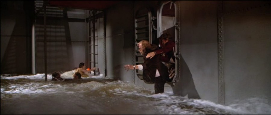 How can “The Master of Disaster” only give us machine gun fights at a mere ten paces, or a so-called slam-bang finale where a dangerous scuba escape from the ship takes a mere thirty seconds? They lower themselves into the open hole…and paddle to the surface. Done. That’s it. And everything in-between is the occasional explosion in the smoke stacks (how many times can those same two stacks from the first movie blow, actually?) while the actors throw themselves around the obviously stationary sets. This is where the waterlogged rehash Beyond the Poseidon Adventure commits its unpardonable cardinal sin: it’s a boring actioner—something no disaster movie can afford to be.