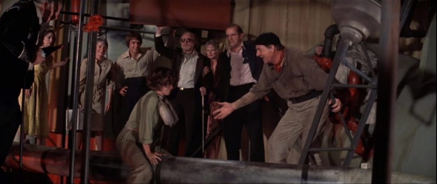 Beyond the Poseidon Adventure has two villains—Savalas’ terrorist (but he says he isn’t one) and Boyle’s lesser loudmouth father—but the script has Caine appear far more sanguine about the obviously dangerous Savalas, than the random friction that pops up out of nowhere between him and ineffectual blowhard Boyle (a rather pathetic attempt to clone the Borgnine/Hackman fights from the first outing). The backstory revelations about the two villains are mismatched, as well: we learn absolutely nothing about Savalas’ main character, while supporting player Boyle gets to be a Freudian-challenged jealous father. It’s a piddling, low-bar dramatic conflict: he’s worried about Harmon touching his daughter (at least Borgnine had to worry about some john recognizing his gorgeous ex-prostitute wife, Stella Stevens).