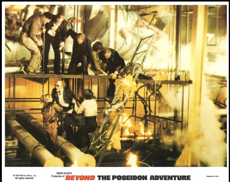 From all the accounts I’ve read, Irwin Allen had intended to premiere Beyond the Poseidon Adventure way back in 1974, to capitalize more closely on the original 1972 blockbuster (The Poseidon Adventure is still in the top 100 all time top grossers, adjusted for inflation). Allen planned on reuniting the “surviving” cast members from that movie with a plotline that somehow buried them in a collapsed train tunnel from which they had to escape. When Allen moved from Fox to Warner’s, he took Beyond with him, while he waited for a new scenario (now set back on the still-sinking Poseidon) from Paul Gallico, the author of the original The Poseidon Adventure novel. In the novel, the Poseidon sank at the end, as Allen intended it to do in his first movie version. However, when a last-minute special effects shot of the boat going down didn’t pass muster, the Poseidon was allowed to remain afloat in the movie’s final shot, unintentionally opening the door for the sequel to return to the capsized boat.