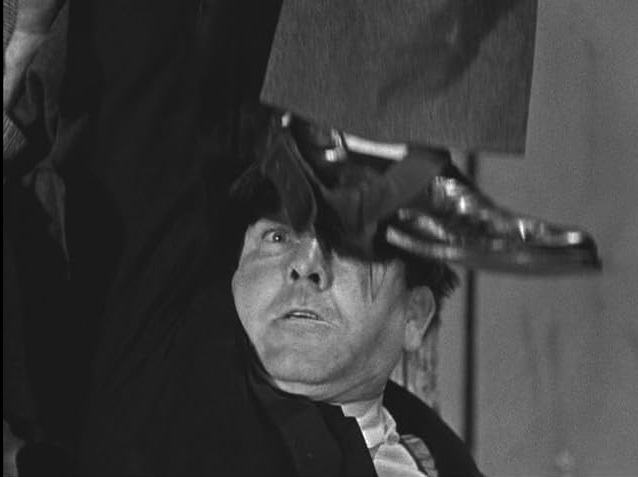 Almost spookily violent, They Stooge to Conga rightfully carries the honor of being the most mayhem-soaked Stooges short; watching it for the first time can be a paralyzing moment of incredulous awe at the Stooges’ sophisticated orchestration of brutal carnage in the service of laughs. This may be the perfect distillation of the Stooges’ primal, elemental appeal, where an actual plot is most decidedly secondary to a series of increasingly violent encounters between the Stooges, until both the audience and the Stooges themselves can hardly believe how far events have gone afield of the bounds of civilized society. Directed by Del Lord, and written by Monte Collins and Elwood Ullman, They Stooge to Conga expertly builds from the Stooges’ first encounters as door-to-door salesmen, to the increasingly chaotic events inside the spy’s house, where they try and repair a doorbell. Certainly the scene where Moe endures three punctures to his skull, ear and eye from a climbing spike worn by Curly (punctuated by a hilarious, sucking “ker-splunk” sound each time the spike is pulled out), rates as a Top Five moment in the Stooges’ pantheon. A beautifully surreal nightmare of hilarious violence.
