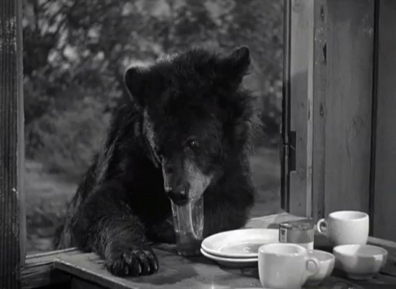 “While out in the country to rest his nerves, Moe cooks a delicious breakfast that gets devoured by a bear. But believing Larry and Curly at it pushes him over the edge.” The last Stooges short before Curly’s stroke finds him reduced but trying for the backwoods hijinks here as a bear pretty much steals the show (the bear eating the honey out of the tall jar, where it really has to stick its tongue down in there to get it all out, is as funny a scene as anything else in the picture). It’s obvious something is clearly wrong with the star, who evidently was only weeks away from his stroke. The new classical “Comedy” mask front title appears for the Stooges for the first time here. Highlights include Larry and Moe making the most disgusting-looking pieces of bread ever, and the bear signaling a left turn when he drives away in their car.