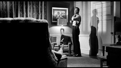 After the pre-Untouchables montage of stock footage showing the mob doing their dirty work (complete with pre-Walter Winchell sound-alike), and with Smathers confidently assuring us that no one in a position of authority had a hand in these corrupt criminals’ activities (rrrriiiiiiiiight), we go to a cleanly-designed sequence where all-American college assassin Ted Delacorte zaps two Cubans getting off a plane (Sears includes a creepy shot of Baer rolling his key-lighted eyes over Beverly Garland’s body before we get two close-ups of the corpses, their faces covered in thick tomato sauce). After a double killing, there’s nothing like a sex party, so we cut to Tony Brill’s island hide-out (sound familiar?), where he flicks his reptilian eyes over Ted’s newest conquest (Sears is sure to give us a departing ass shot of Brill’s property, as well as a later wide, full pin-up shot of the girl, lounging on a chaise) before declaring she’s to be moved to Detroit, as a shill.