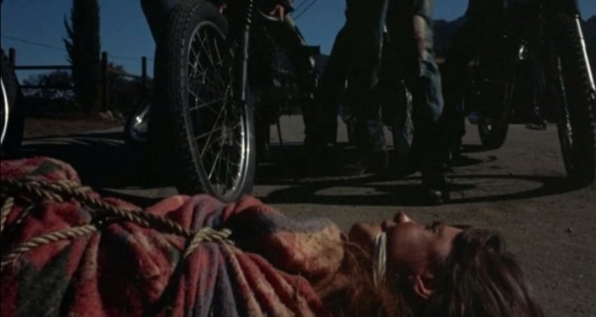 Director Schwartz knows how to show cruelty, whether it’s Rebel staring straight down in the camera as he chokes out Ben with a rope, or a blanket-wrapped Kristie getting dragged between two motorcycles (a crazy stunt that doesn’t look faked—watch Walton grimace in pain when a motorcycle wheel actually snags her head), or his two extremely graphic rape scenes, the first shot in a druggy, psychedelic, Manson Family orgy style, with a fish eye lens and surreal lighting, or Kristie’s near-rape in the woods, shot much more realistically (perhaps too realistically—a couple of those actors look like they’re losing their cool as they really rough up the actress, as Walton believably looks quite frightened).