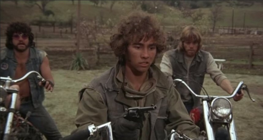The story’s too-familiar setup, like so many biker movies, is nothing more than a transplanted Western plot with hogs replacing horses. And the screenplay’s mechanics are creaky, at best. Why in the world do Rebel and his friends stash a re-captured Kristie out in the open, where anyone with eyes could see her and where she could easily roll three feet out into the lodge’s parking lot for help, while they go get drunk in the bar (so she can be conveniently rescued by Black Widow, that’s why)?
