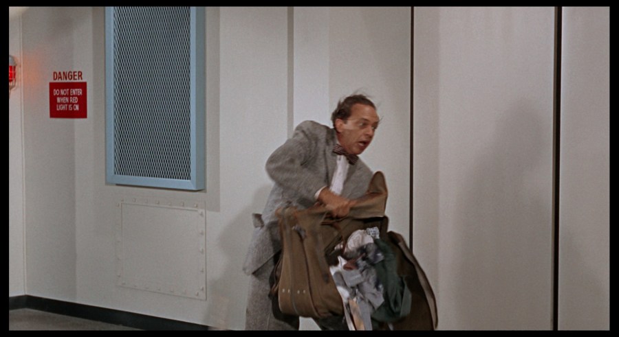 The Manned Spacecraft Center section (some establishing shots were allowed for the movie) are geared more towards slapstick, including Roy’s first realization that he’s not an astronaut but a janitor (the centrifuge blows all his clothes out of his suitcase, before he admits to Donelli: “I had a little trouble with my underwear,”), as well as later, when Buck visits, such as snow coming out of Roy’s air-conditioned space suit, and his accidentally igniting the rocket sled (“Whoa, boy!” Roy screams).