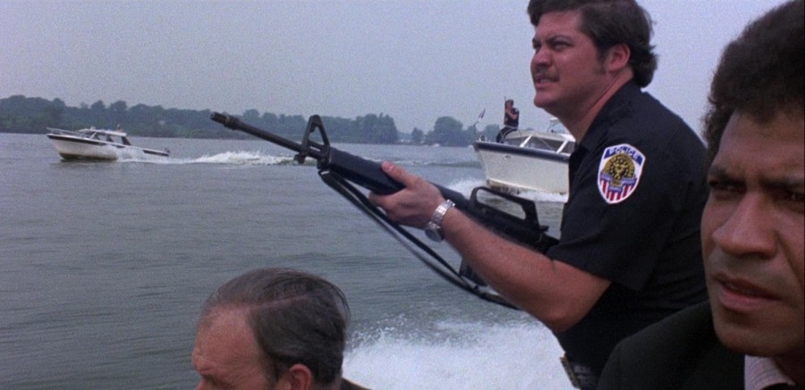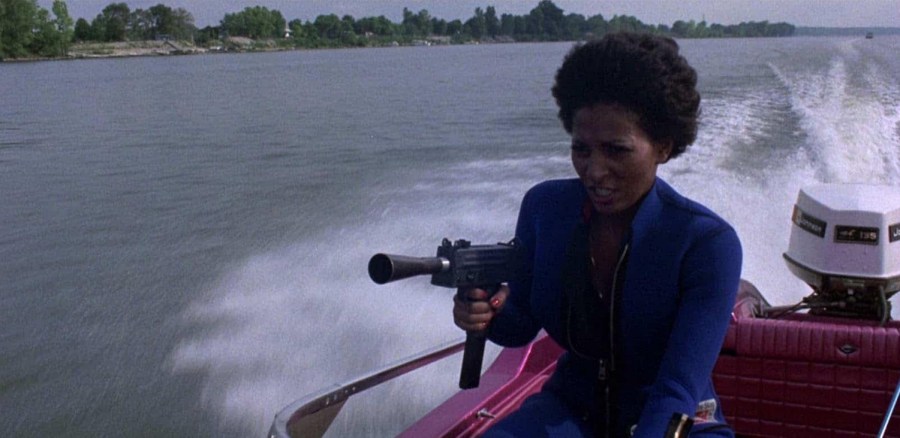 As for the finale, when Girdler channels Thunderball with a Dr. Goldfoot and the Girl Bombs budget, we get endless shots of a bored-looking Grier slinking back and forth to the boat, before she’s glumly chasing the villain on the muddy green Ohio, ready to harpoon him of all things.